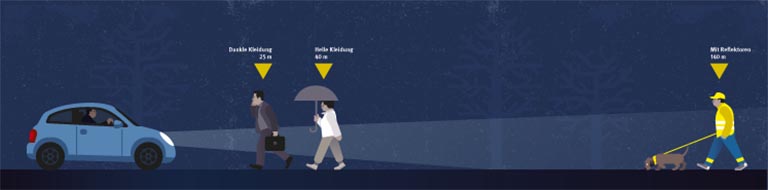 Diese Illustration zeigt einen PKW, der einen Mann mit dunkler Kleidung und eine Frau mit heller Kleidung anleuchtet. Ein anderer Mann mit reflektierender Kleidung und einem Hund mit reflektierender Leine wird ebenfalls von dem Lichtkegel des PKW's erfasst.